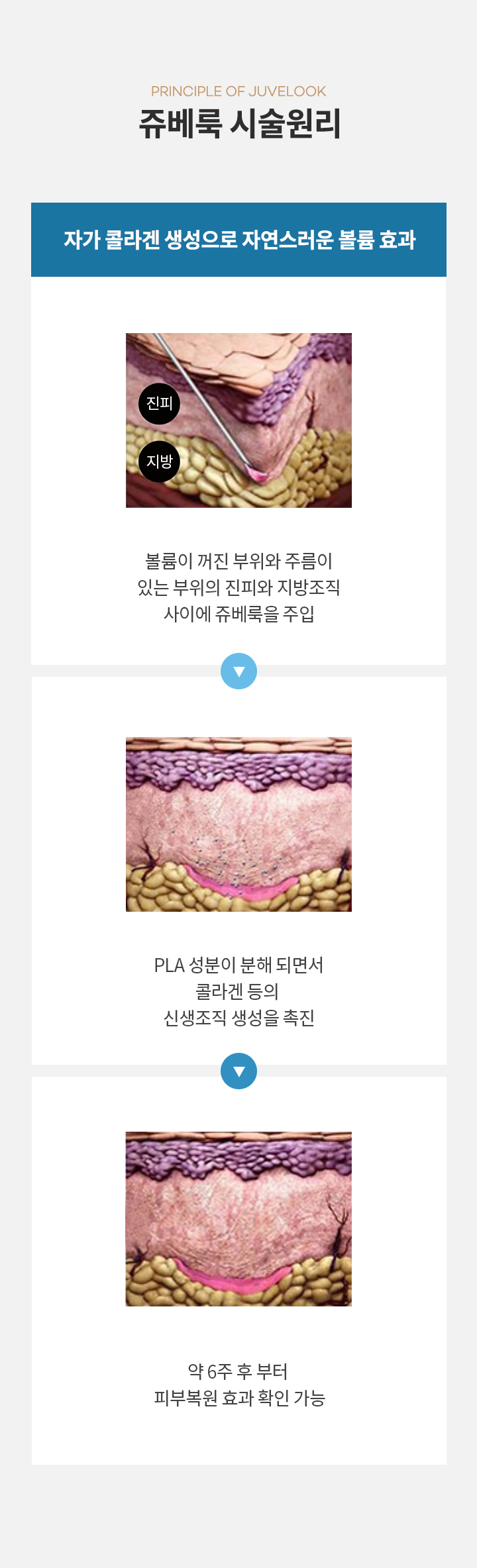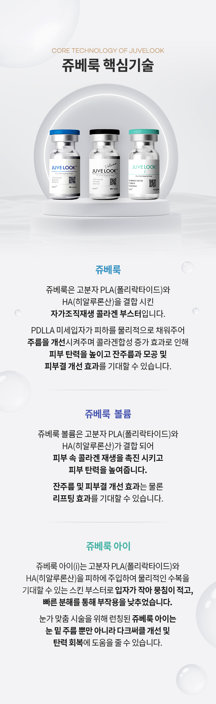 쥬베룩은 고분자 PLA와 인체 피부 조직에 존재하는 히알루론산을 결합시킨 자가 조직 재생 콜라겐 부스터입니다.