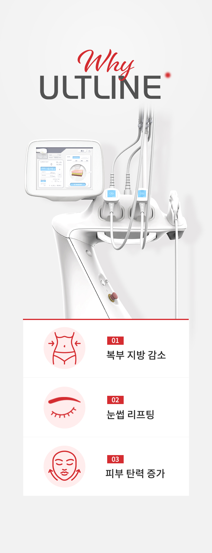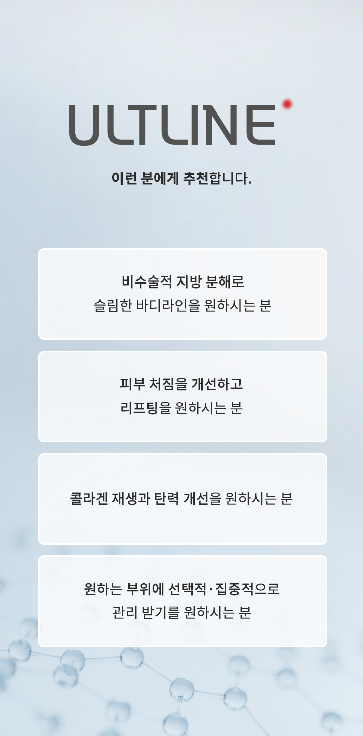 다양한 피부층에 강하고 보다 안전한 에너지를 전달하는 ULTLINE. 개개인의 피부 상태, 고민 부위에 따라 맞춤형 시술을 제공합니다.