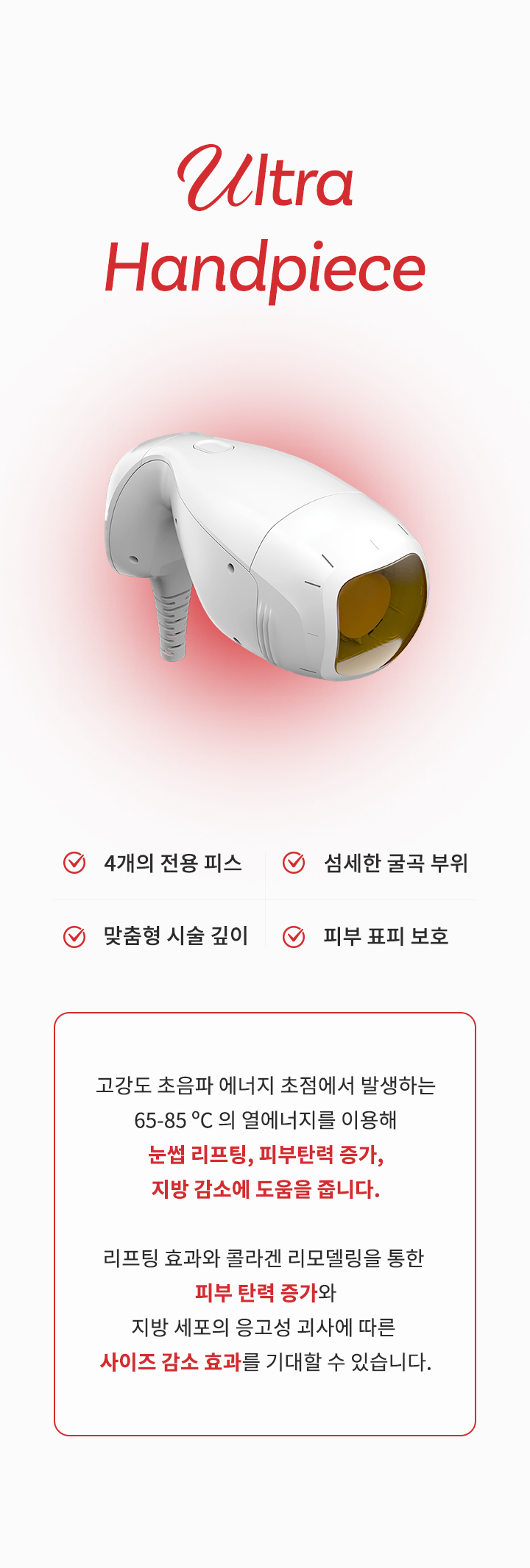 고강도 초음파 에너지 초점에서 발생하는 65-85 ºC 의 열에너지를 이용해 눈썹 리프팅, 피부탄력 증가, 지방 감소에 도움을 줍니다.