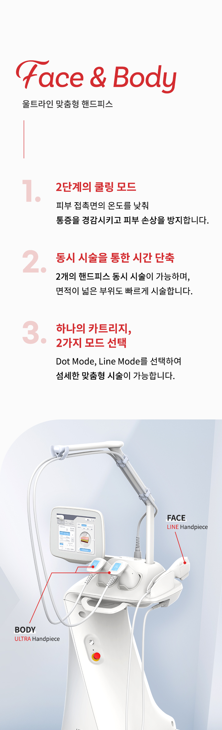 2개의 핸드피스 동시 시술이 가능하며, 면적이 넓은 부위도 빠르게 시술합니다.