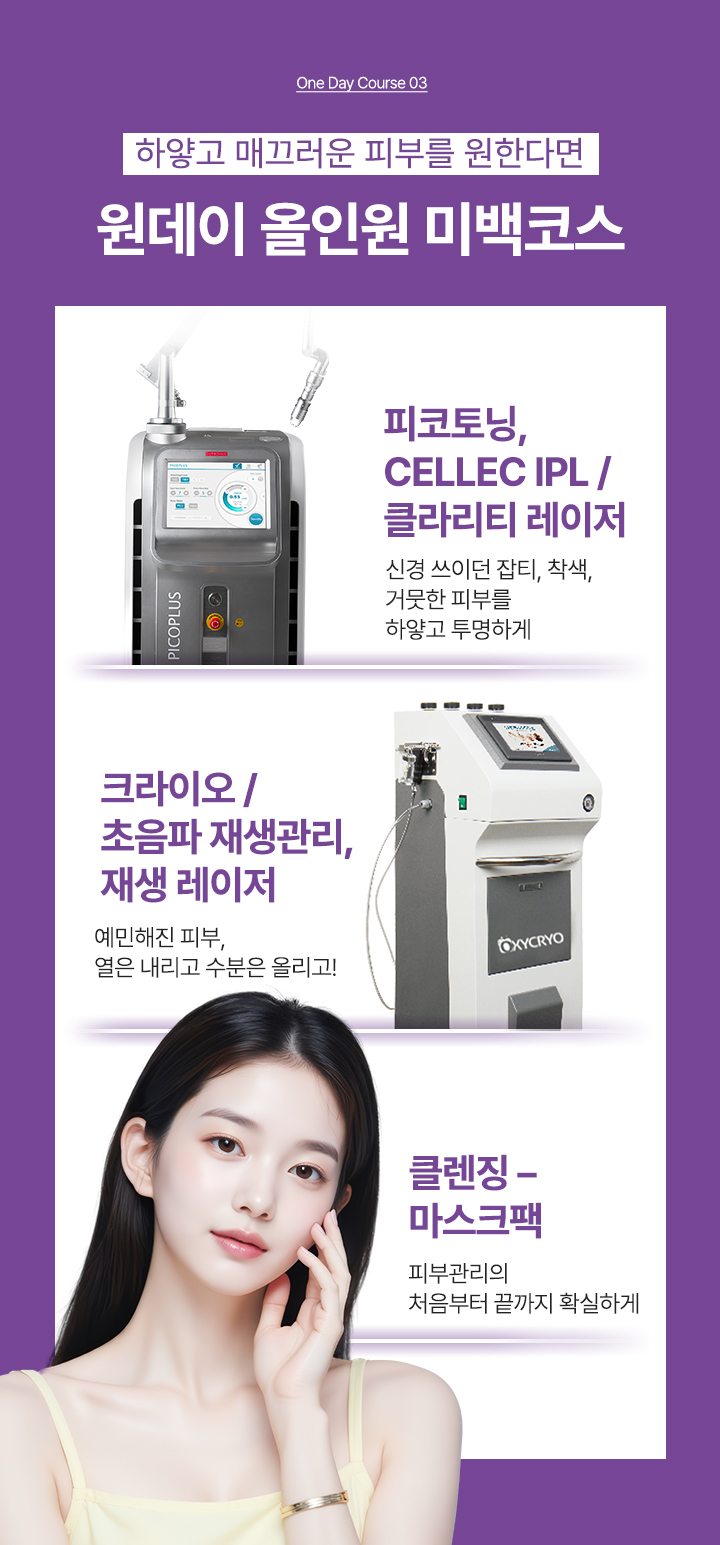 클렌징 + 피코 토닝 + CELLEC IPS 레이저 + 클라리티 레이저 (735nm) + 크라이오 진정 관리 or 초음파 재생 관리 + 재생 레이저 + 모델링 마스크 팩